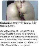 UN MIO AMICO MI HA SCOPATO IL CULO Questa mattina mi è venuto a trovare un mio carissimo amico di tanti anni di conoscenza..ma non sò come è potuto accadere ma tra un caffè e una chiacchiera abbiamo scopato! e aggiungerei che mi ha sfondata il culetto. Poi però avevo ancora tanta voglia ,perchè questa situazione mi ha eccitata tantissimo, e allora mentre lui era nell'altra stanza io mi sono fatta il video masturbandomi il culetto e fica con il dildo. Culetto aperto in primo piano e la sborra del mio amichetto che ancora mi usciva...Video Full Hd con audio Buona visione porconi